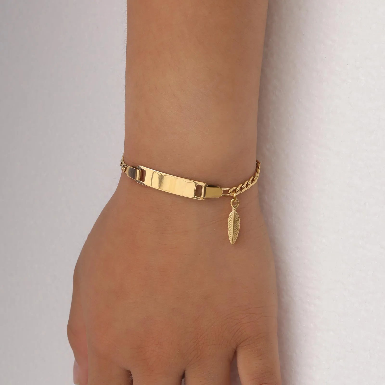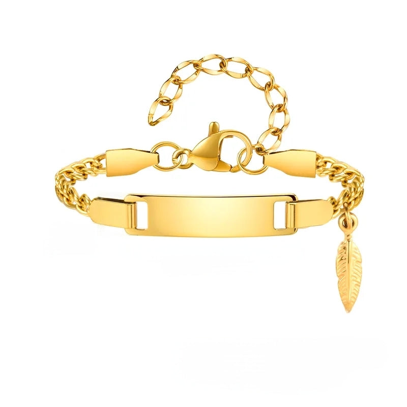 Bracelet Baby LOU en acier inoxydable avec une petite plume suspendue.